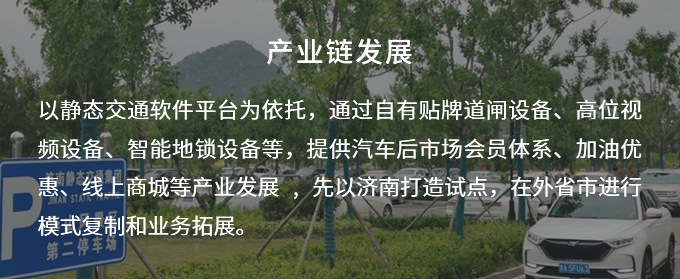 以靜態(tài)交通軟件平臺為依托,通過自有貼牌道閘設(shè)備、高位視頻設(shè)備、智能地鎖設(shè)備等,提供汽車后市場會員體系、加油優(yōu)惠、線上商城等產(chǎn)業(yè)發(fā)展 , 先以濟(jì)南 打造試點(diǎn),在外省市進(jìn)行模式復(fù)制和業(yè)務(wù)拓展。